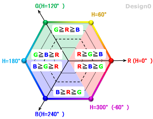「HSL正六角形」をRGBの大小関係で6エリアへ分類